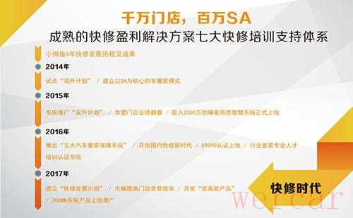 从2014年试点“双升计划”引入“快修”业务尝试开始,2015年向加盟系统推广“双升计划”,并上线嘛雀信息智慧系统,在帮助加盟门店业绩翻番的同时,给加盟系统插上了信息化管理、大数据运营的翅膀;2016年推出“五大汽车管家保障系统”,开创国内快修新时代,快修连锁初具规模;2017年通过建立“快修发展大纲”,大幅提升门店交易效率,开发“双高能产品”,为门店赋能。