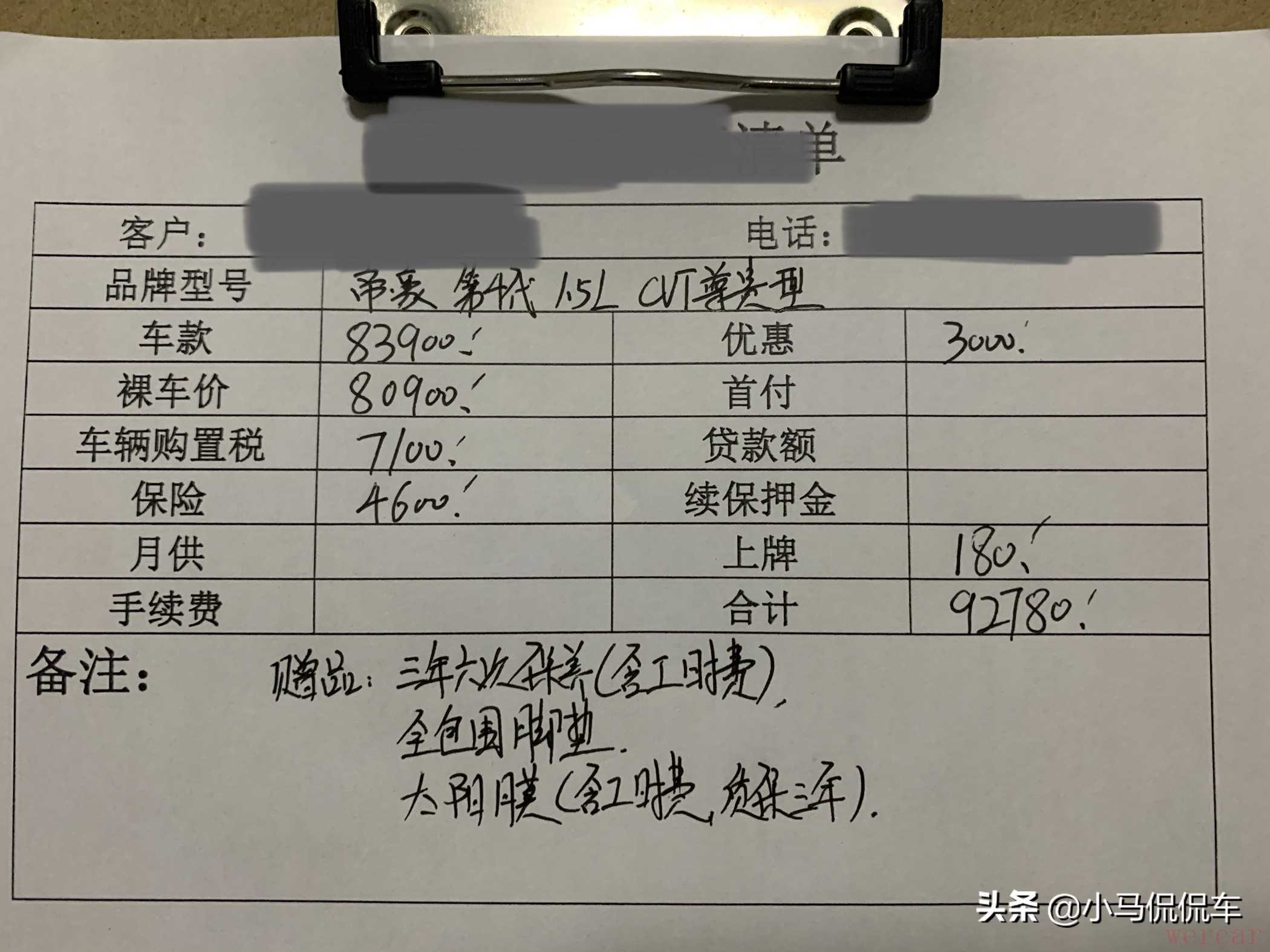 很快我就把别克英朗抛到了脑后,全新帝豪成为了我的“新欢”。最终我入手了指导价8.39万的1.5升CVT尊贵型,现金优惠3000元,实际裸车成交价8.09万。全款买车没什么强制消费,贷款买车感觉没必要,因此直接全款,购置税7100元,保险4600元,上牌费180元,总落地价合计92,780元。赠品包括三年6次保养,全车脚垫和贴膜,包含所有工时费。不知道我这价格买的算不算便宜。