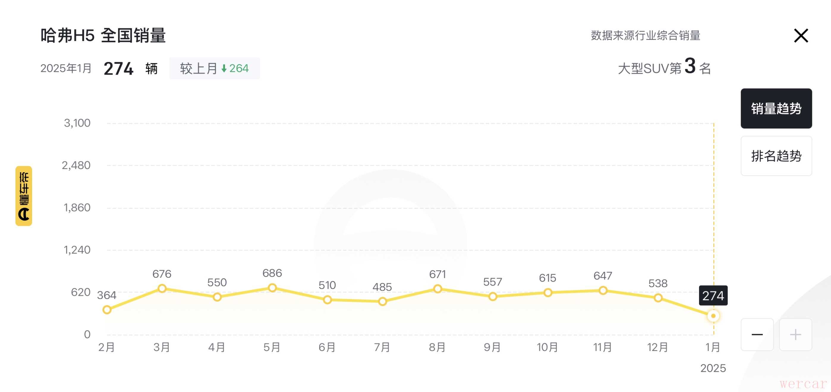 哈弗H5定位于大型SUV,重点强调工具车属性,与当前大型SUV市场其他在售车型存在明显差异。根据现款车型售价以及定位来看,同级车型中并没有直接竞争对手。结合销量数据显示,2025年1月,哈弗H5销量为274辆。有关2025款哈弗H5的上市信息,懂车帝将持续关注。