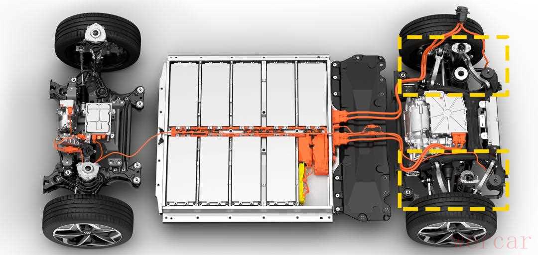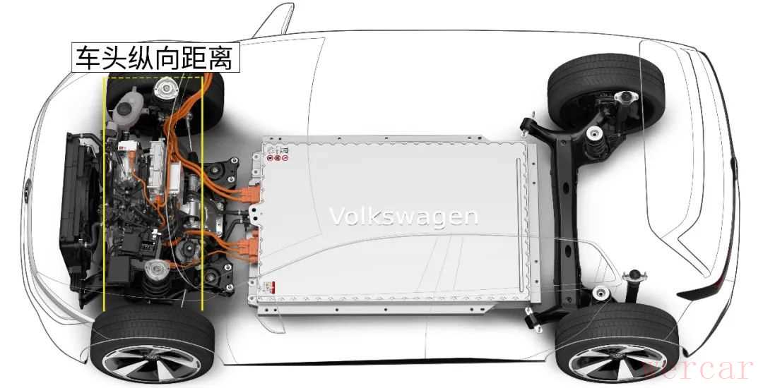 上:前置前驱 / 下:后置后驱前面提到的比亚迪海豚,是通过缩小动力系统尺寸的方法,减少了车头非吸能区的长度,从而提高了轴距。即便如此,位于海豚车头的动力系统仍然需要占用一定的纵向空间,也就是说,车头非吸能区的长度并没有被缩减到最小。但如果能改变电动车的动力布局,把电机、减速器、电控系统从前桥移到后桥,那么车头的非吸能区将会降到最小,从而实现轴距的最大化。从动力布局灵活性和体积可以看出,在轴距利用上,电动车具有天然的优势。