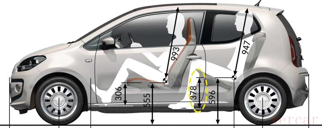 大众up!车身布置这里所说的坐姿,准确来说是脚与臀部之间的相对高度。以燃油车大众up!的坐姿设计为例,它的前排乘客脚后跟与臀部之间的相对高度为306mm,由于坐姿比较低,所以座垫距离车顶的高度达到了993mm。不过,为了避免前排乘客坐姿太低出现“窝着”的感觉,前排乘客可以将腿向前伸展,来加大膝关节的角度,坐得更加舒服。