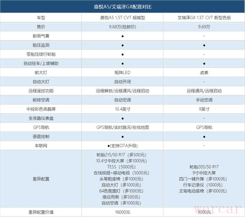 以二者最受关注配置车型为例,嘉悦A5 1.5TCVT超越型在“抢掀价”加持下,售价仅9.68万元,比艾瑞泽GX CVT新型色版更实惠一些,但配置价值上的差距可达到13000元。如下表所示,嘉悦A5的10.4寸中控大屏、在线视频+移动电视、头等舱座椅、64色氛围灯、TESS爆胎应急安全系统等核心加起来,账面价值可达到16000元,而艾瑞泽GX仅3000元,可实用价值上的差距却可达十万级!