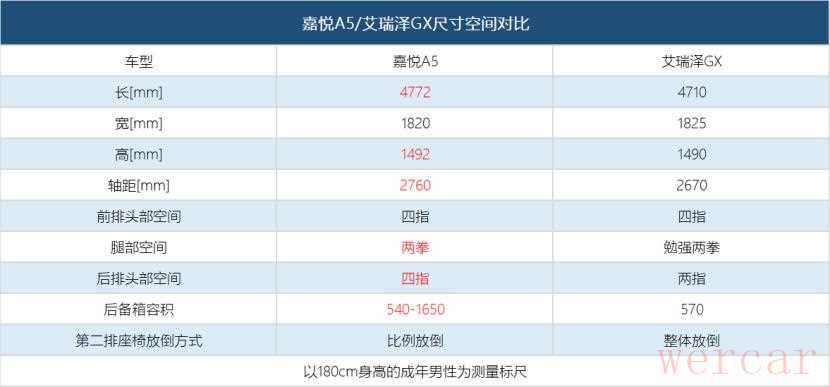 在空间方面,双方工程师都尽力发挥车长和轴距的数据,营造出舒适的驾乘氛围。如下表所示,嘉悦A5的长度和轴距足以迈入B级车的范畴,同级最大的身型配合掀背造型和高采光天窗,使得车内氛围通透敞亮,不显压抑,这很容易给人带来心灵上的好感。更重要的是,高挑阔长的车身能带来伸张空间,就算你是个180cm的大汉也能有前后排头部四指、腿部两拳的奢享坐姿。这多少让尺寸小些的艾瑞泽GX自惭形秽了,尤其是其后排局促得影响了长途乘坐的舒适性。