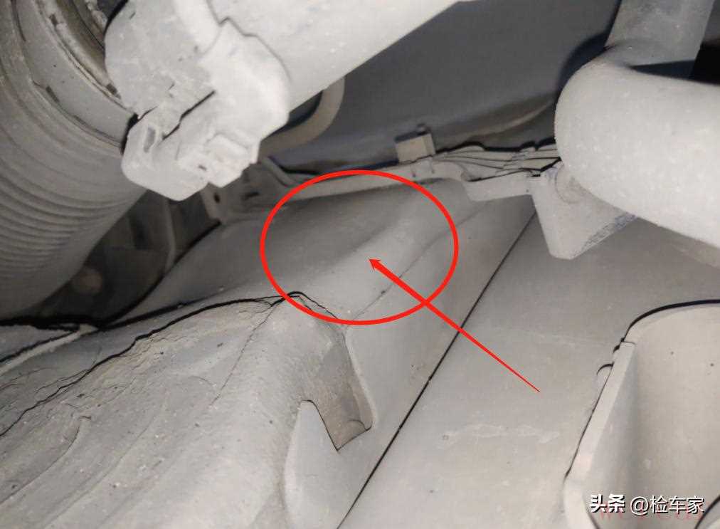 最后从下面检查全车纵梁,发现右前大梁上面有变形,可能是撞击导致右前悬挂位移顶到了右前大梁上面。这可就麻烦了,在国标里面右前大梁有变形,就属于重大事故车了,真可惜,就这么一点。其实这么一点变形,自己用的话影响不大,对于纵梁刚性的影响很小了,但是对于车辆价值的影响比较大。果然如果仅仅是翼子板和大灯更换,是不可能导致车价这么便宜的。
