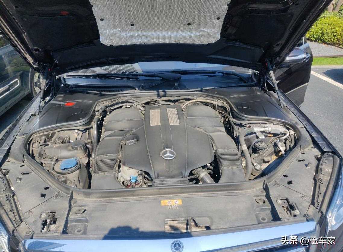 这辆奔驰S350L搭载的是一台3.0T双涡轮增压发动机在,最大马力313,最大扭矩480N·m,匹配9AT变速箱,百公里加速仅需6.8秒,整体动力水平还是相当不错的,目前机舱也没有明显的渗漏和拆卸痕迹,马上来看看细节。