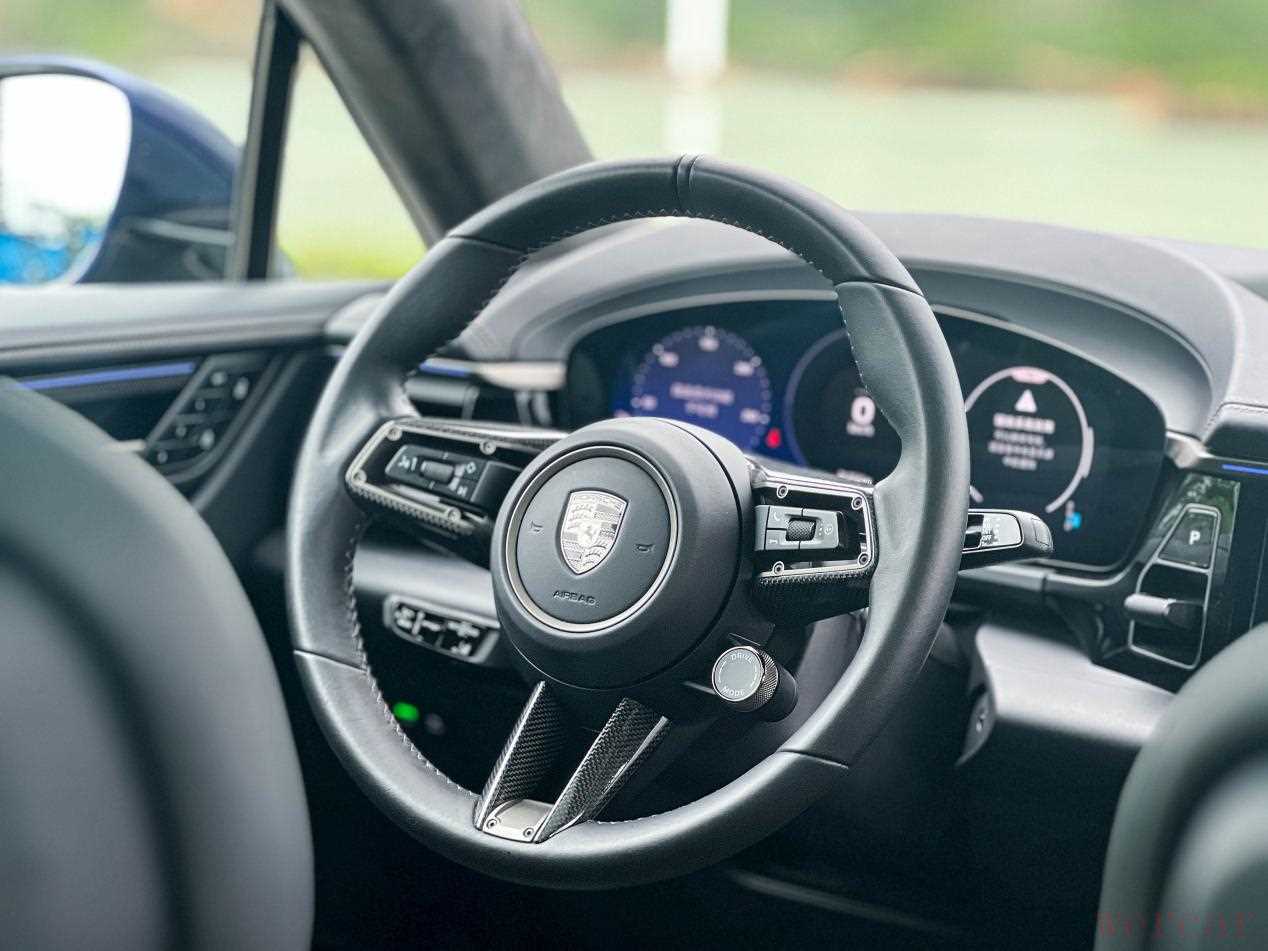 拉开车门,低矮的重心设计立刻将你拉入熟悉的保时捷语境。坐进驾驶席,身体瞬间被包裹进支撑性绝佳的舒适型运动座椅中,而且这车还带加热通风功能,是长途的福音。相比上代燃油版,驾驶位坐姿显著降低了28mm,跑车般的贴地感扑面而来,但视野并未牺牲,反而更显通透开阔。指尖搭上方向盘,那经典的、带着点韧劲的紧致感立刻建立连接,这熟悉的手感,是保时捷与驾驶者无声对话的起点。按下启动键,没有引擎的轰鸣预热,只有仪表盘安静地点亮。然后这车开起来的感觉也十分地道,虽然没有涡轮迟滞,也没有转速爬升,一股庞大、直接、近乎蛮横的力量,瞬间从后背袭来,把我稳稳按在椅背上。这感觉,不同于燃油Turbo那种需要等待的爆发,更像是被一股持续的、线性的巨力直接从静止“推”了出去。 在高速路况好的时段尝试过全力加速,3.3秒破百的官方数据在体感上甚至显得有些保守。那种纯粹、无衰减的G值持续作用,是电动时代赋予“Turbo”的全新内涵,也给到我一种令人信服的、颠覆预期的加速底气,超车非常有信心,这是其他车给不到的感受。如果将模式旋钮拧到“Sport Plus”模式,空气悬挂会进一步绷紧车身。小编印象比较深刻的一个场景,在前往西坑水库的蜿蜒山路中,尽管柏油路雨后有点湿滑,但开着Macan入弯前重刹,那套高性能制动系统的咬合力和线性脚感,真的能给足信心,车身姿态依然稳如磐石。转动方向盘切入弯心,精准又犀利,甚至路感可以透过方向盘清晰地传递到指尖,你能感觉到前轮在湿滑路面上寻找着最佳抓地点。