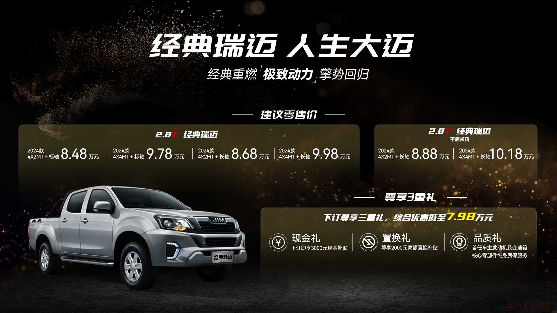 2024款经典瑞迈搭载的动力则是源自于日本五十铃的4JB1系列的JE493发动机,继承优势的同时,还进行了升级和优化,比如说:该发动机采用了博世高压共轨燃油系统,通过精准控制油气比例使得经济性提升高达5%,从而降低了运输成本。在参数上,这台2.8T柴油发动机最大功率88千瓦,峰值扭矩为285牛·米,匹配5挡手动变速箱,提供两驱和四驱版本,官方百公里油耗能够低至7.9L。