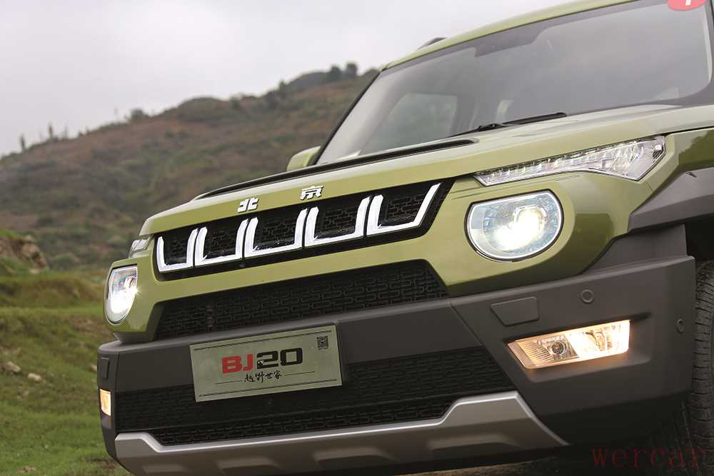 BJ20同样也有这样两个“突兀”的圆形前大灯,配合上方窄长的LED日间行车灯,还真有炯炯有神的味道。进气格栅是BJ品牌家族式的设计——5颗镀铬“大板牙”——让你一眼分出这家伙绝对出自于BJ之手。宽厚的前保险杠透着那么一份儿野性,将BJ20整体的硬朗感觉提升了一个等级。