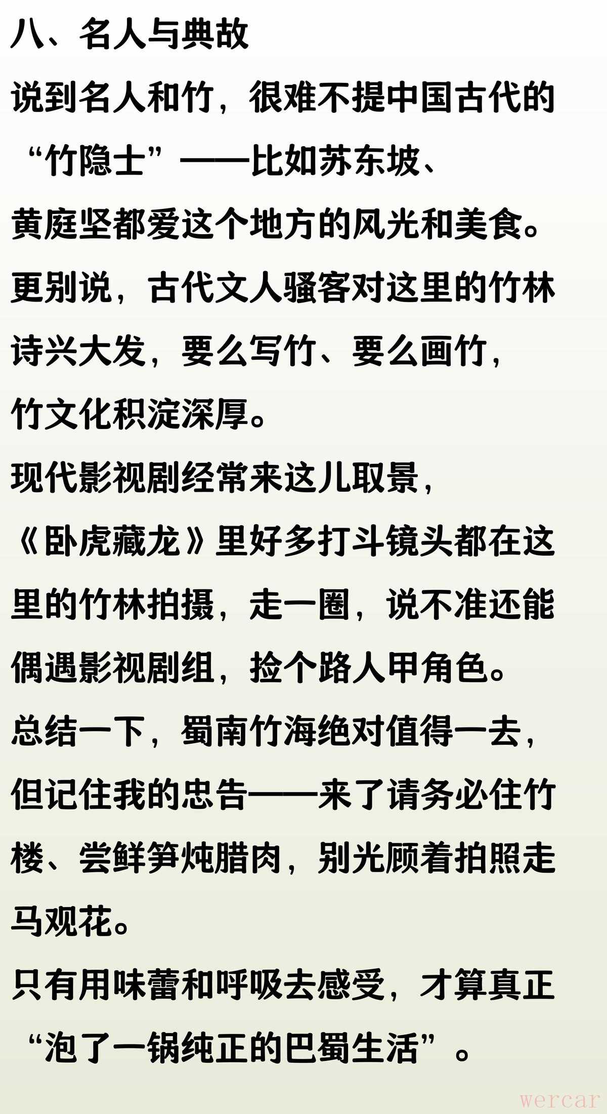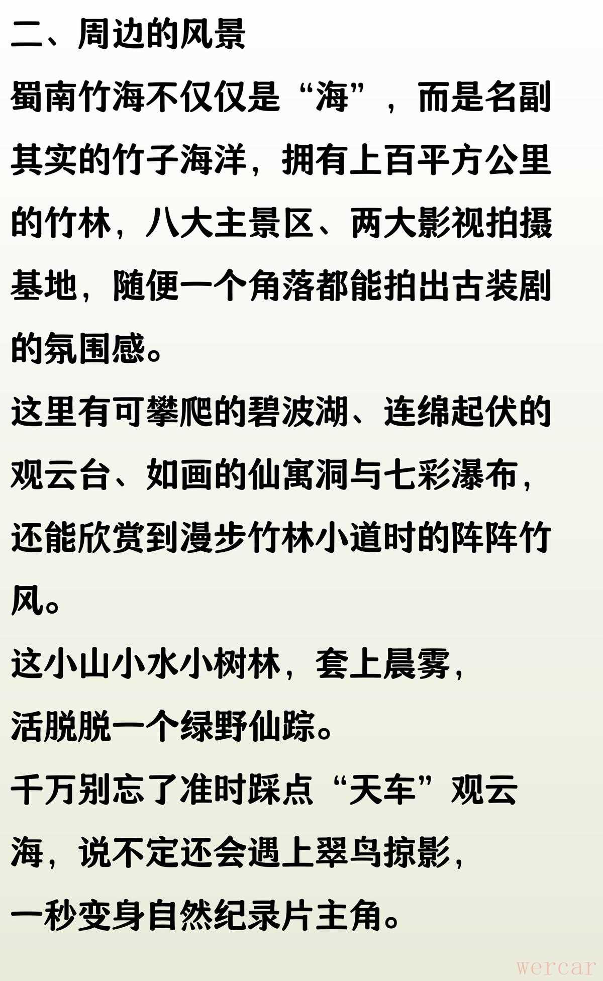 1.  "深入体验竹海意境":不仅仅是看,而是要感受竹子带来的清凉、静谧、幽深的感觉。需要走进竹林,在竹影婆娑中漫步,才能真正体会到那种“绿竹入云、清泉飞瀑”的意境。