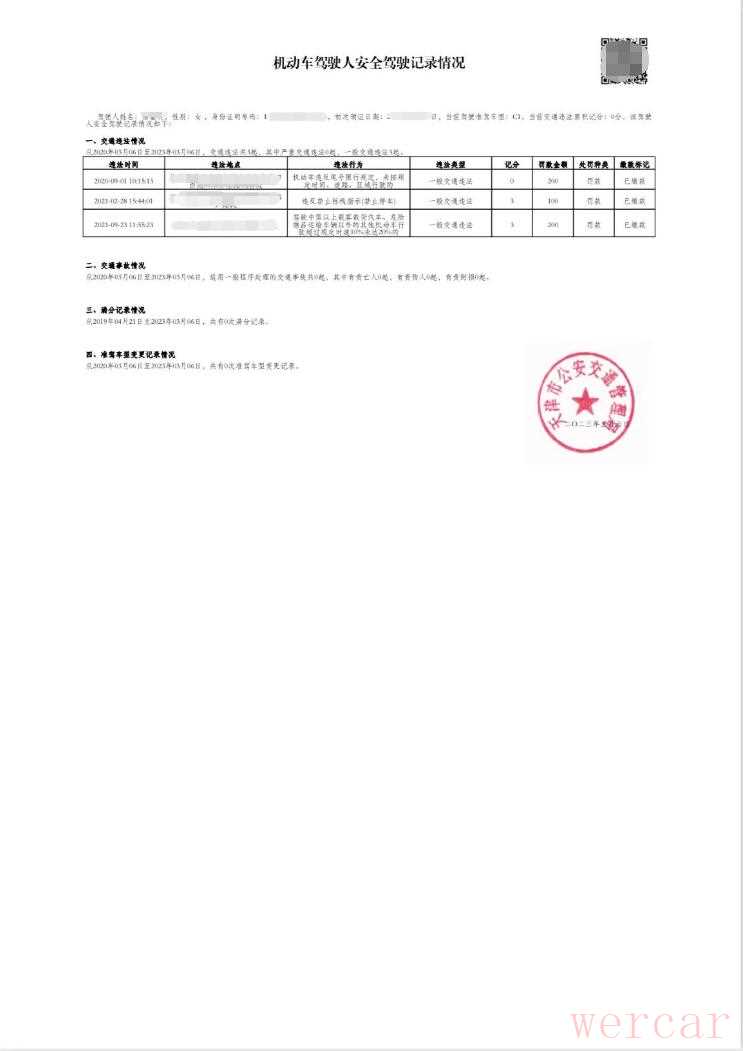 五是对于存在以上记录的驾驶人,可点击下方“查看详情”按钮,查看近三年内每起交通违法的时间、地点、具体违法行为以及违法类型、处罚种类、记分和罚款金额,交通事故,近三个完整记分周期内的满分记录,准驾车型变更记录等详情;