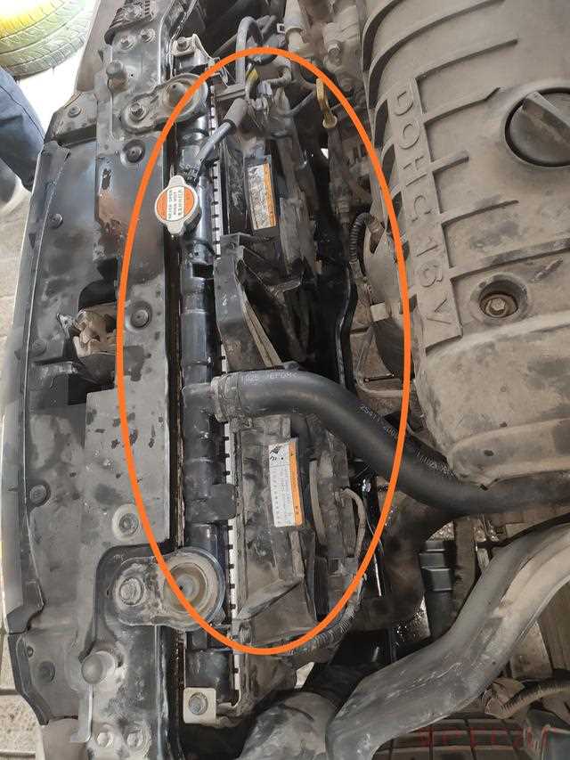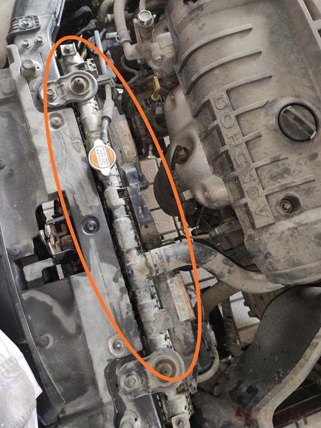 解决方案其实也很简单,从上图圆圈中可以看到,水箱的金属散热器与胶木储水箱的连接处已经严重老化,单从防冻液的氧化物质来看,泄露已经存在了很长一段时间;由于不清楚此时的高温究竟带给发动机多大的伤害,所以现在唯一能做的两件事分别是更换水箱和祈祷发动机没有因为高温而拉缸、变形。