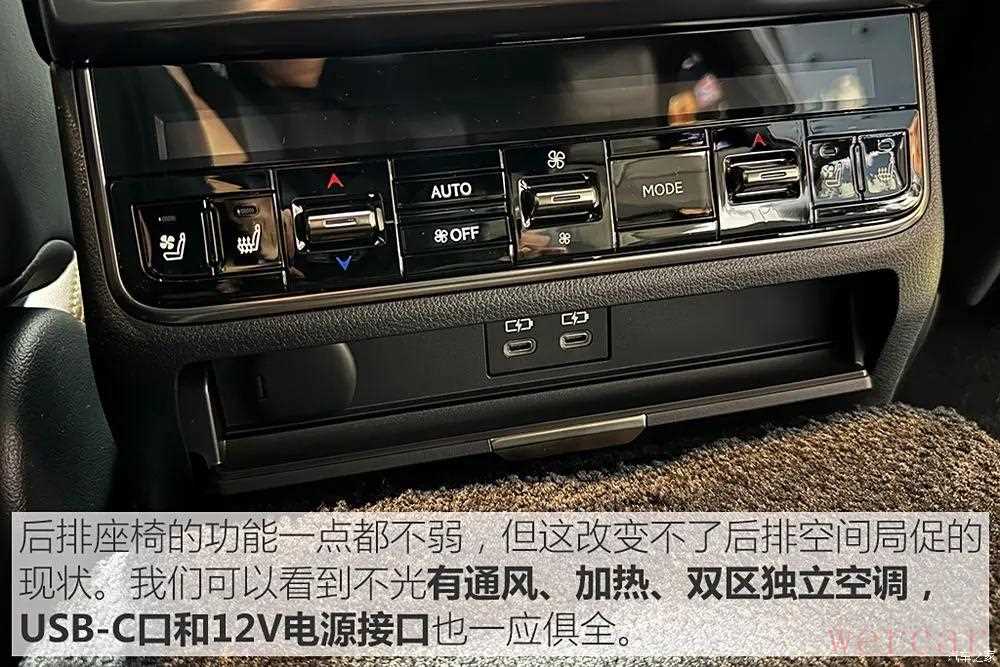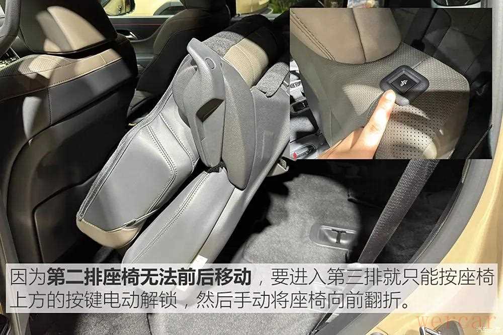 要进入第三排座椅,则需要按动二排座椅上的电动翻折解锁按键,然后将座位向前翻折,才能够将将够的“爬”进第三排。雷克萨斯LX700h OVERTRAIL领境版的第三排座椅就是标准的小板凳,没有任何舒适性和腿部支撑可言。两侧到是为乘客提供了杯架和USB-C充电口,甚至能够电动调节第二排座椅,可关键是谁愿意长时间窝在这里呢?
