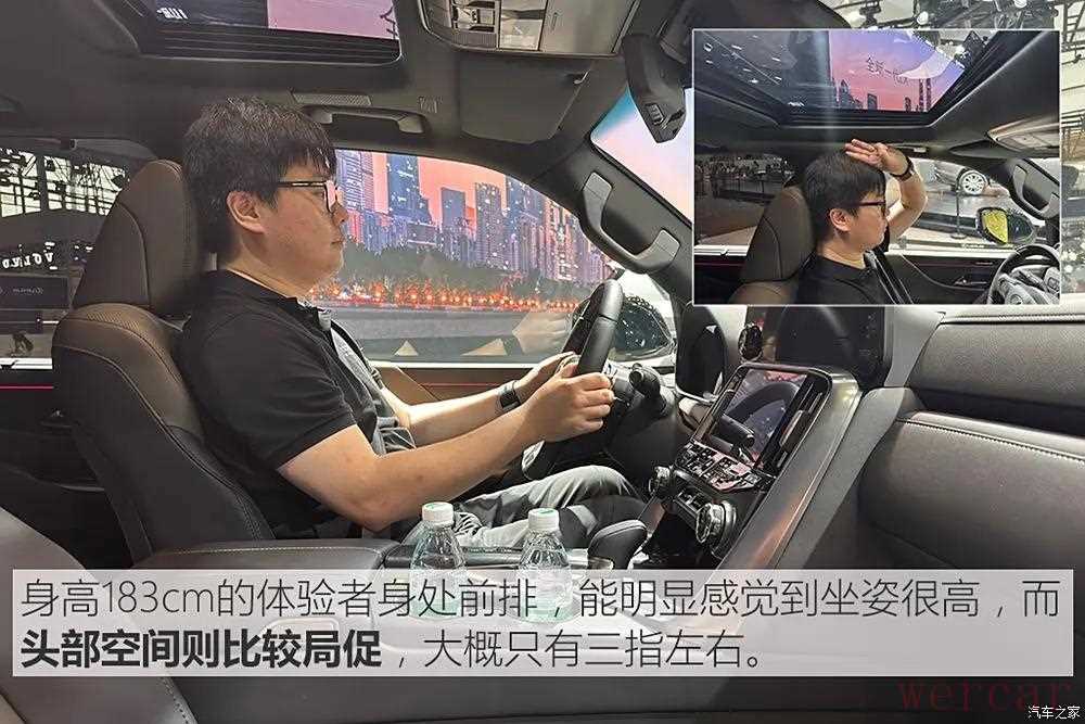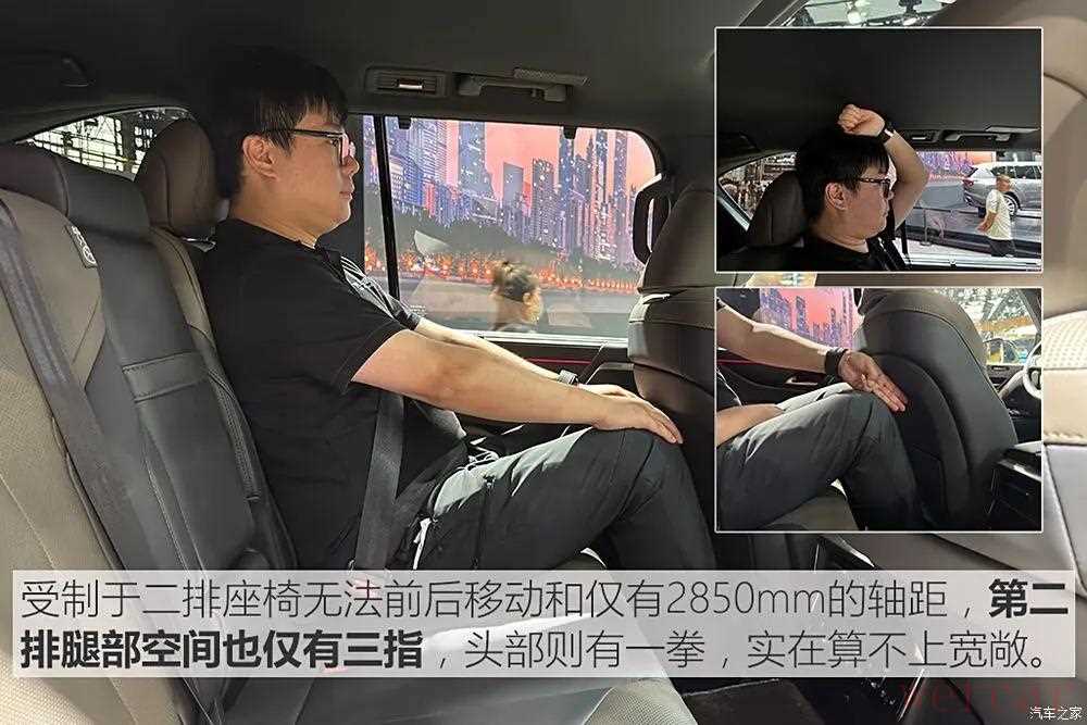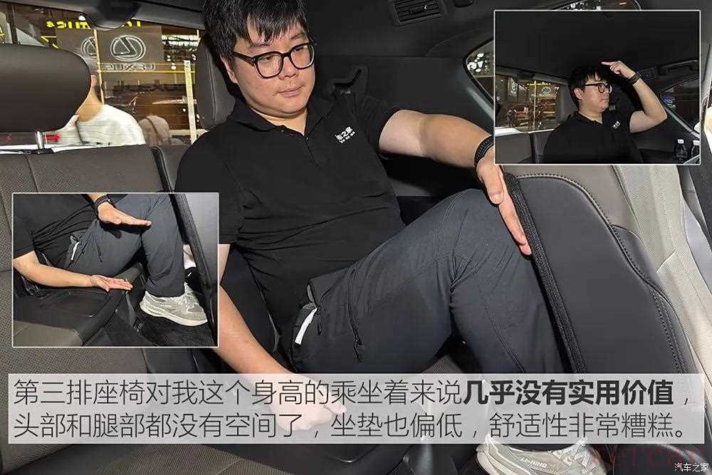 车内方面我们重点来谈空间,之前说到过这台车只有2850mm的轴距,这就注定了雷克萨斯LX700h OVERTRAIL领境版的后排表现依旧可以用“糟糕”来形容。身高183mm的体验者身处前排,能明显感觉到较高的坐姿,同时头部空间也仅有3指左右,不压抑但也谈不上宽裕。