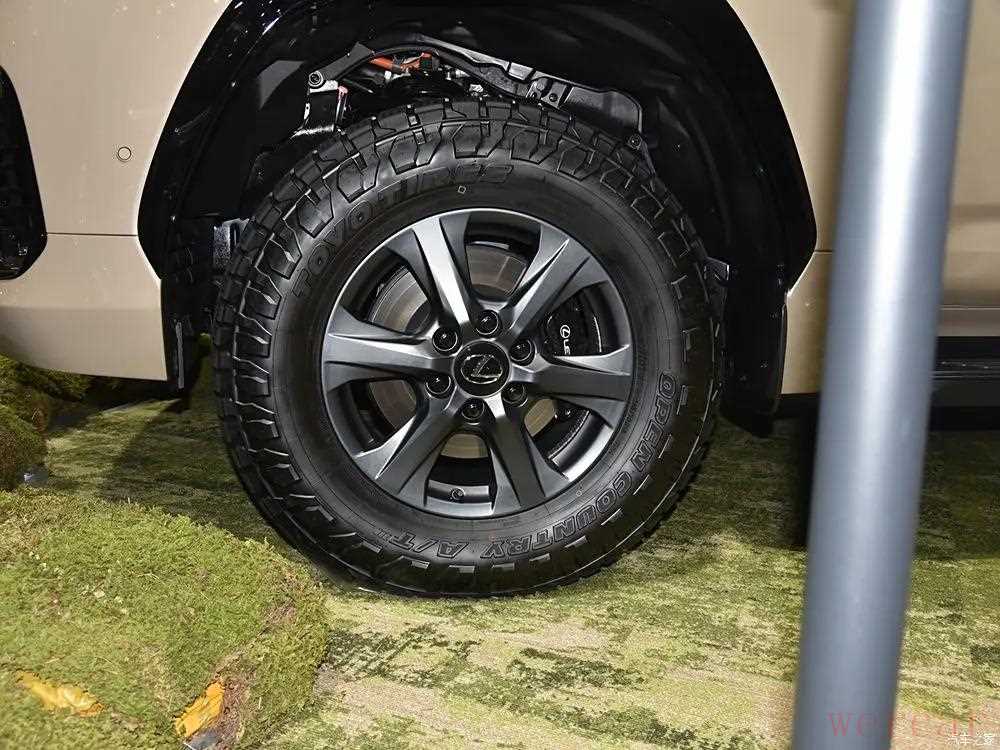 雷克萨斯LX700h OVERTRAIL领境版的后视镜、门把手以及轮圈都采用了黑色的喷涂,尤其是它的黑色轮圈,规格仅为18英寸,搭配来自东洋轮胎的A/T胎,无疑更适合于在非铺装路面使用。反观更加豪华定位的VIP领世版,除了一身靓丽的镀铬饰条外,还会搭配20/22英寸两种规格的高亮轮圈,用来展现LX700h车系豪华的一面。