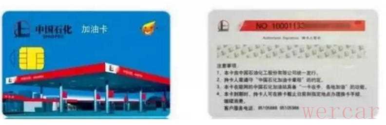 中国石化的加油卡由中国石化统一发行,加油卡正面为蓝色,有中国石化标识、芯片和加油站图像,反面为白色。