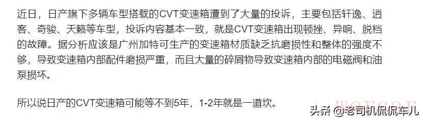 以下是一些经常被提及的关于日产CVT变速箱的“痛点”: