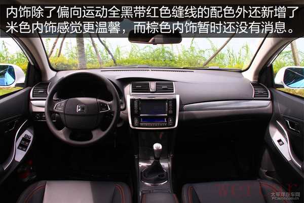 再来看看2016款众泰Z300的两款内饰设计,首先全黑搭配碳纤维纹理饰板和银色镀铬颜色和材质过度的很柔和,车门上的弧线设计非常很精致,档杆的形状和材质选择也很合适,再加上座椅上的红色缝线,全黑内饰尽显运动风。