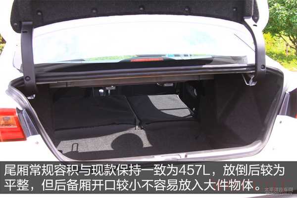 尾箱的内部空间十分规整,空间还算给力但是后备厢开口有点小,高度被全尺寸备胎侵蚀了不少,附赠千斤顶等工具,后排放倒之后几乎全平,尾箱通向后排的通道开口很大也十分规整,但在出口处我们找到了两个结构加强件至于原因就不得而知了。