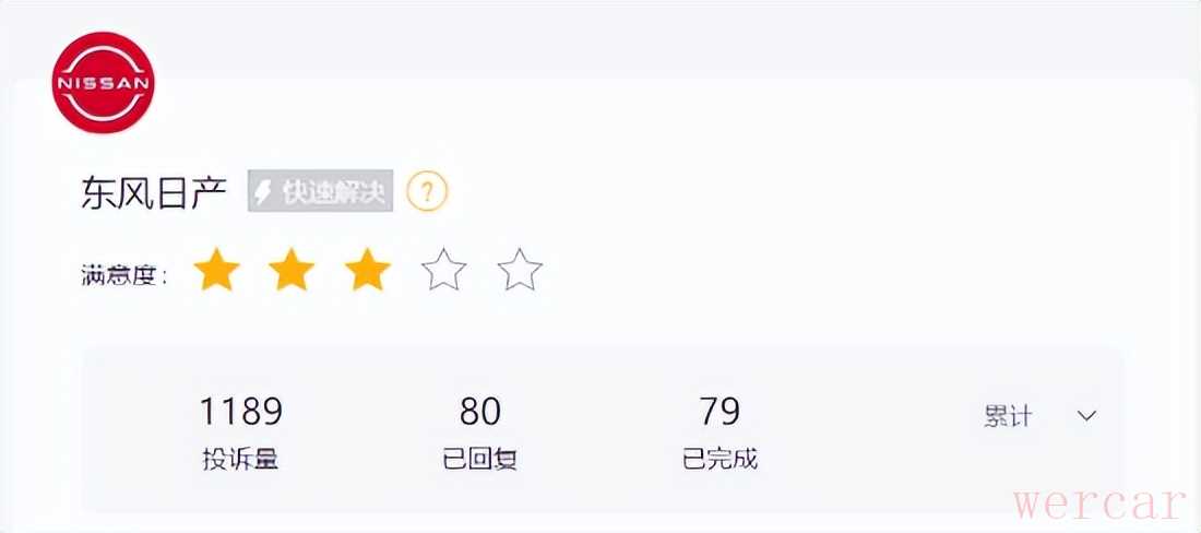 《次世代车研所》栏目在黑猫投诉上看到,目前东风日产的累计投诉量为1189件,其中已回复仅80件,已解决仅79件。