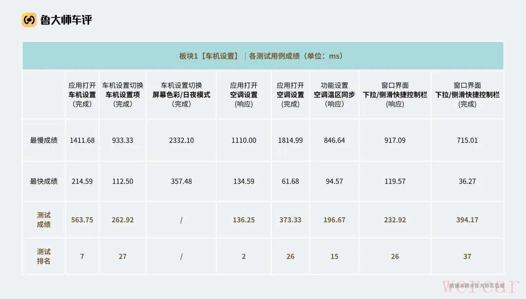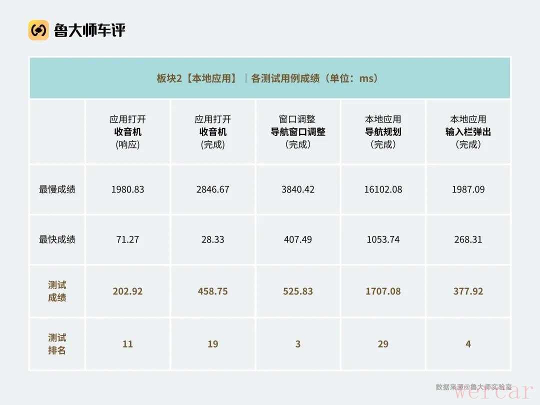 但进入「本地应用」板块,表现开始分化。打开收音机只需202.9ms(第11名),导航窗口调整仅525.8ms(第3名),但一旦涉及到复杂的路径规划,系统就显露出符合大家对油车刻板印象中“慢”的一面——1707.1ms(第29名)。