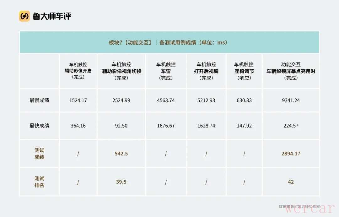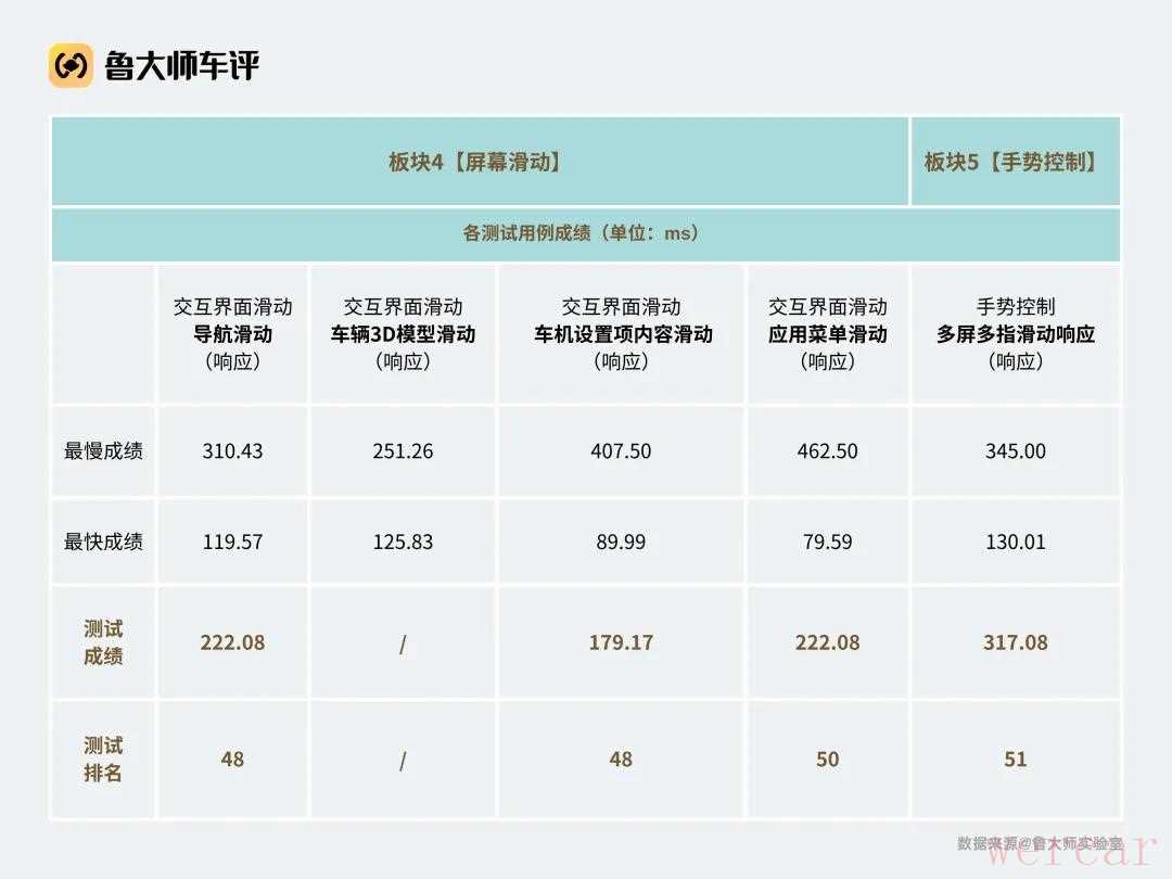 然而,「屏幕滑动」和「手势控制」却拖了后腿。尽管成绩都在百毫秒级别,但在这两个板块中,奔驰 E260L 的排名表现都是吊车尾的水平。