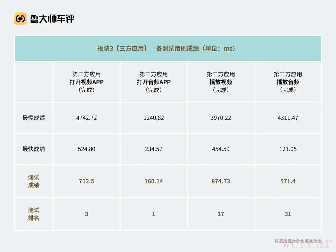真正的亮点出现在「第三方应用」。奔驰E级的音频类APP启动仅需160.14ms,在所有测试车型中拿下第一名;视频应用打开也仅712.5ms(第3名)。这意味着8295平台的资源调度和媒体优化在E级上得到了充分释放,娱乐体验堪称奔驰车机系统的一次“飞跃”。