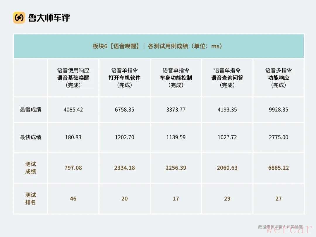 在「语音唤醒」板块中,基础唤醒797ms从速度上来说尚可接受,但在打开应用、控制车身功能等指令上,普遍需要2秒以上才能执行,尤其是多指令响应高达6.8秒,几乎难以支撑连贯对话。