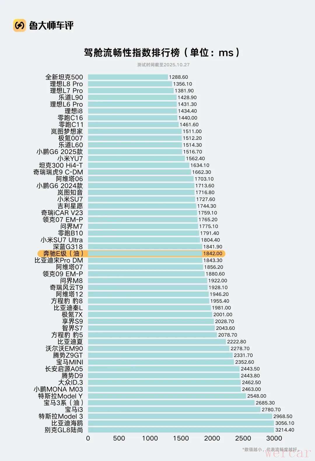 经过29个测试单元、10轮反复验证,奔驰E260L的驾舱流畅指数为1842.0ms,在鲁大师汽车实验室已测的53款车型中排名第27名。
