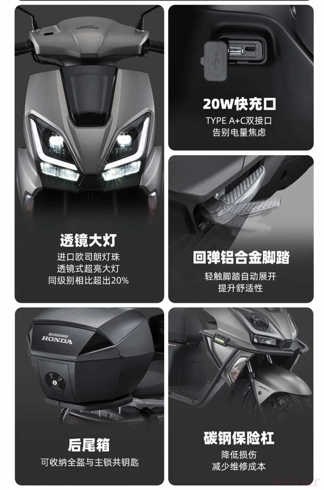 其他亮眼配置倒是不少,全系标配欧司朗LED透镜大灯,夜间照明范围广、亮度足;带有防水盖的20W双USB快充接口(A+C口),能同时满足不同设备的充电需求,手机党出门不愁没电;侧支架熄火和双闪开关也是标配,前者能防止忘收边撑骑行的风险,后者在临时停车或坏路行驶时很实用。部分版本还提供原厂尾箱和护杠,尾箱能放下全盔,护杠则能在轻微磕碰时保护车身 。