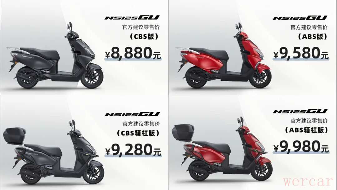 〓 定价亲民 性价比不错新大洲本田NS125GU共推出四个版本,售价区间8880-9980元,其中CBS版8880元,ABS版9580元,加配尾箱和护杠的版本分别贵400元 。这个价格能买到本田eSP发动机、越级空间、半热熔轮胎,以及万元内少见的ABS配置,性价比其实还不错。