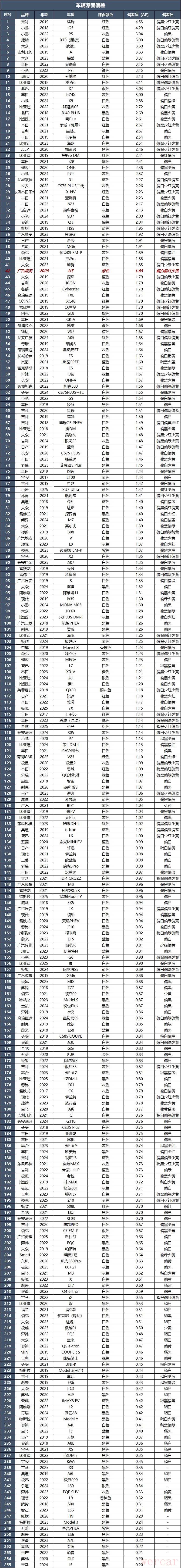 经过测试,最大色差值位于前保险杠处,色差值为1.85ΔE,比基准点偏白偏红少黄。从数值上来看,这辆车的喷漆工艺质量控制比较一般。