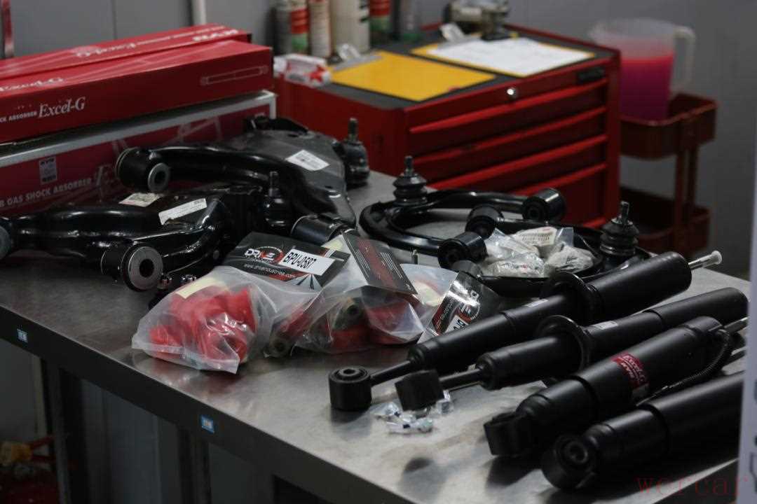 接着...咱们来到底盘方面,首先升级一套KYB避震器,其次拉杆胶套升级为聚氨酯强化胶套,再更换一组全新摆臂、球头。