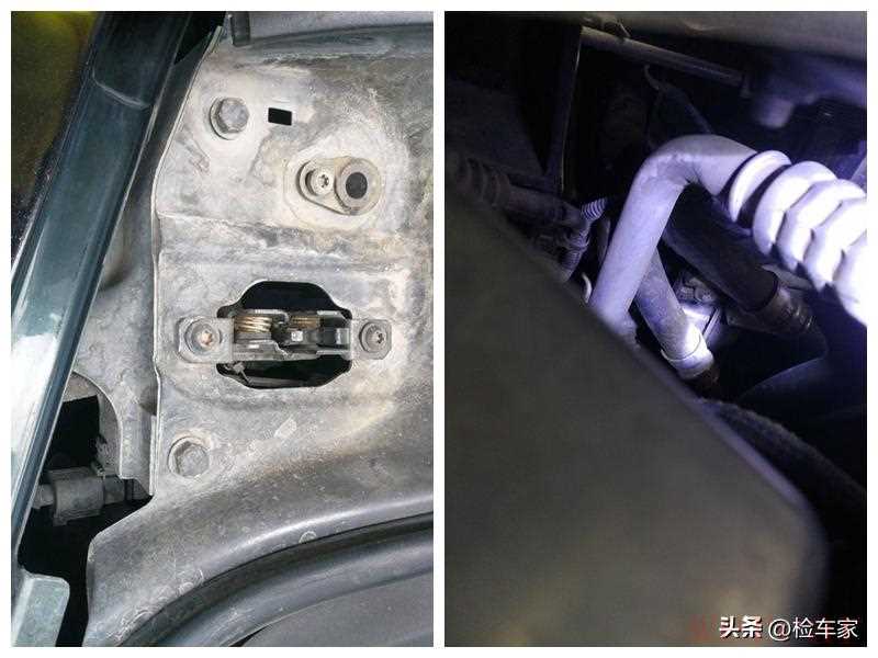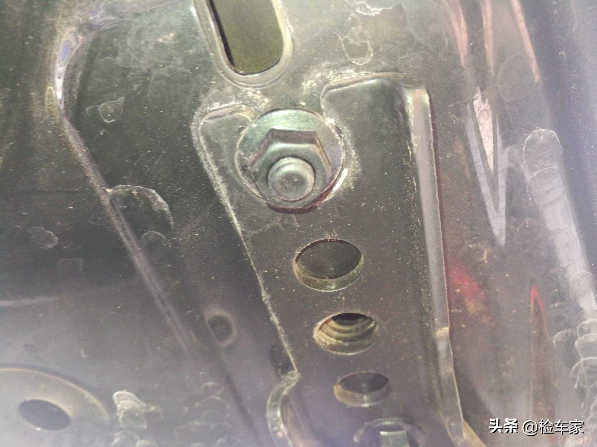 机盖合页的固定螺丝没有拧动拆卸痕迹,左右两侧的叶子板固定螺丝一样没动过,结合前保险杠的检测,我们基本上可以排除车头前部的碰撞事故。毕竟外观件都没伤,事故可不会隔空透过外观件去伤到里面!