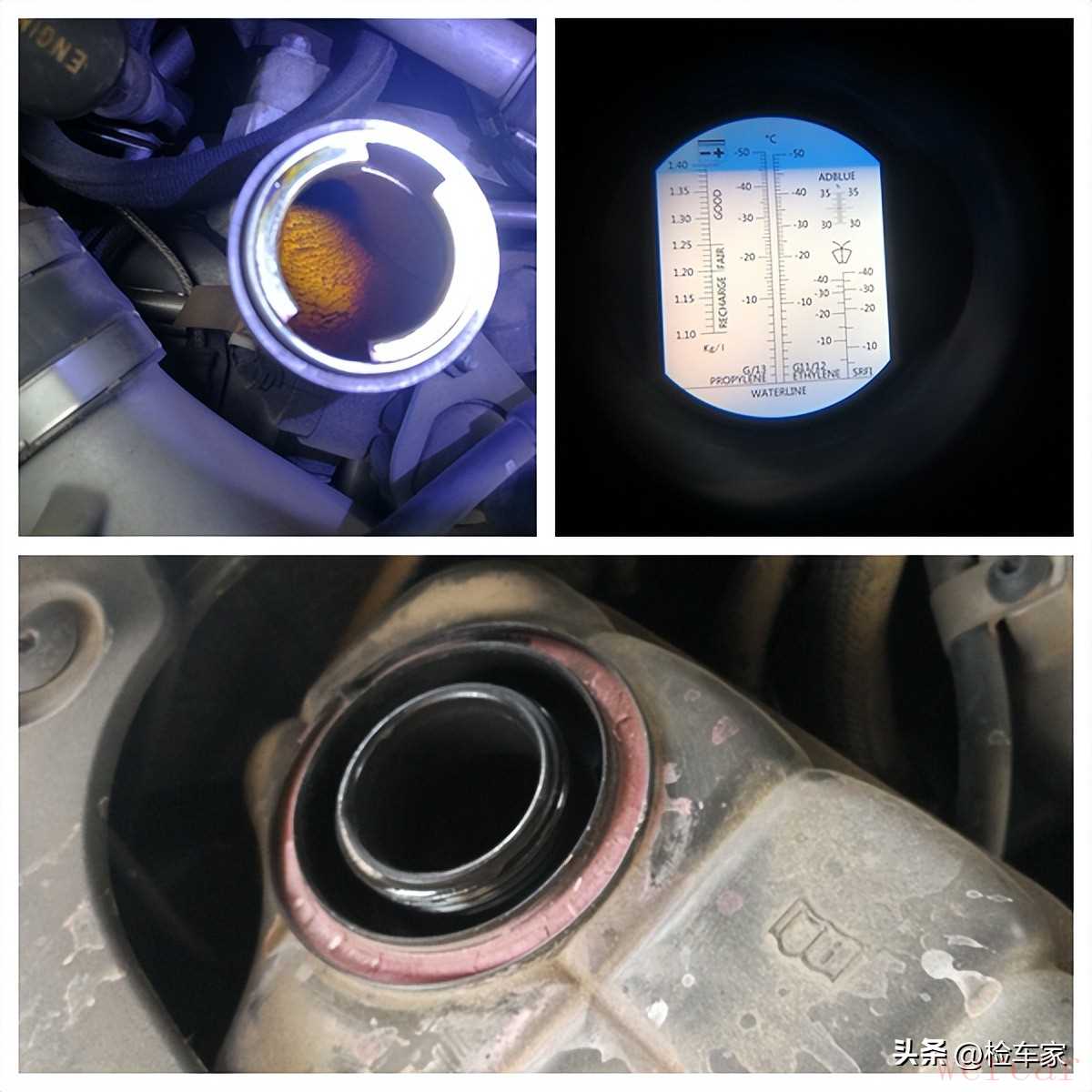 机油加注口不存在积碳油垢,冷却液的冰点也够了,就是水壶壶口有冷却液干涸的痕迹,之前可能漏液了!目前液位也有点低,需要及时添加!