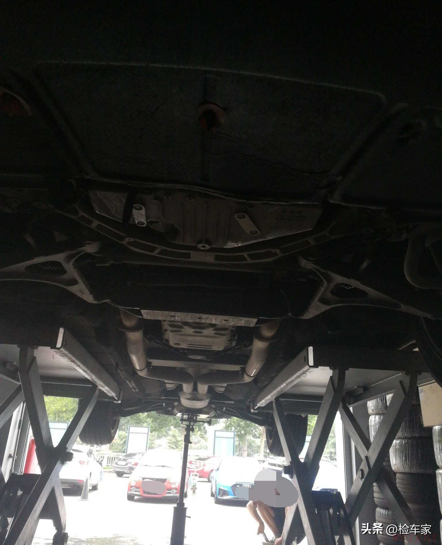 静态检测没什么大问题,将车辆开动起来去检测底盘,路上试了空调、音响等基本的功能配置,同样没问题!一会儿就到了上架子的地方!升起来之后,猩猩看到底盘很干净,十年的车子,都没有特别多的泥土灰尘,也没有托底剐蹭痕迹!原车主平时走的路况应该很好!
