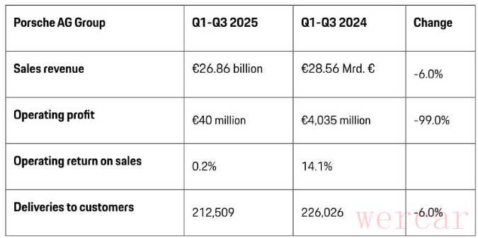 2025年第三季度,保时捷交出了一份令人咋舌的财报,营业利润同比暴跌99%,仅剩4000万欧元,较去年同期的4.035亿欧元近乎“归零”。