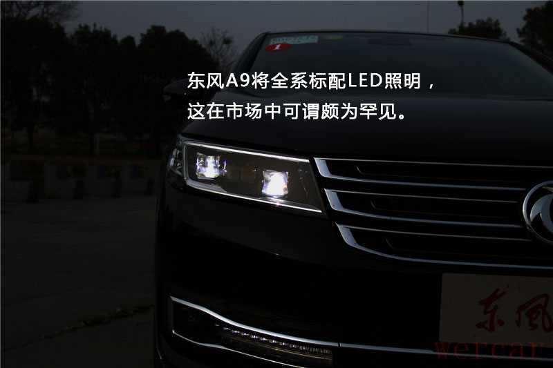 东风A9的前进气格栅由三组横向饰条组成,且每一饰条拟D造型设计,与进气格栅相连的头灯采用LED照明,据记者了解东风A9将全系标配LED照明,这在市场中可谓颇为罕见。