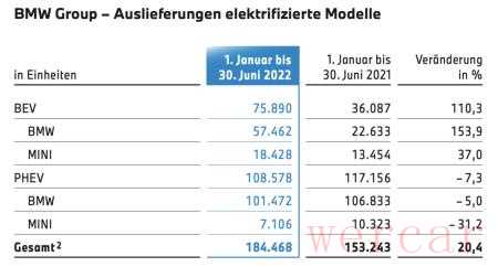 最为人关注的电动汽车销量问题上,2022年上半年,宝马的电动与混动汽车全球销量同比上涨了20.4%,达18.45万辆;其中纯电车型全球销量同比上涨超过110%,达7.59万辆;核心的宝马品牌纯电销量达5.75万辆,同比增长154%。