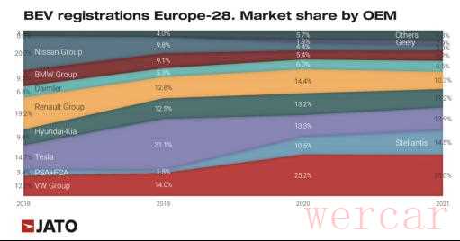 若以2021年全年的各汽车制造商电动汽车总销量进行对比,位列欧洲第七的宝马在欧洲电动汽车市场的份额仅为6.2%,远逊色于大众集团、Stellantis和特斯拉,甚至不如大众集团旗下的奥迪和斯柯达两个子品牌的单独销量。