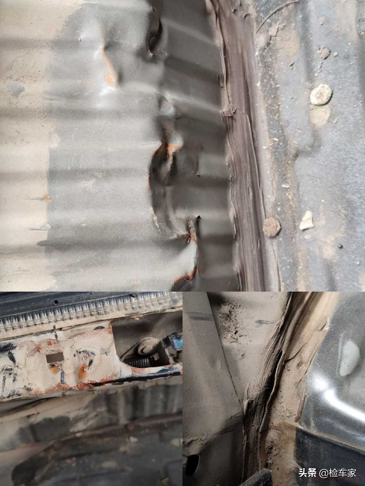 仔细检查发现后备箱锁头有拆卸痕迹。拆卸锁头?这引起了我的注意,赶紧扒开后边饰板,一看后围板变形了,这应该是车辆被别人从后边怼上来了吧?既然后围板变形了,后防撞梁幸存的几率就小了很多。赶紧把发现的情况告诉威哥,威哥说12年了,发生追尾事故是很正常的,你接着检测看看车辆还有没有其他的问题。