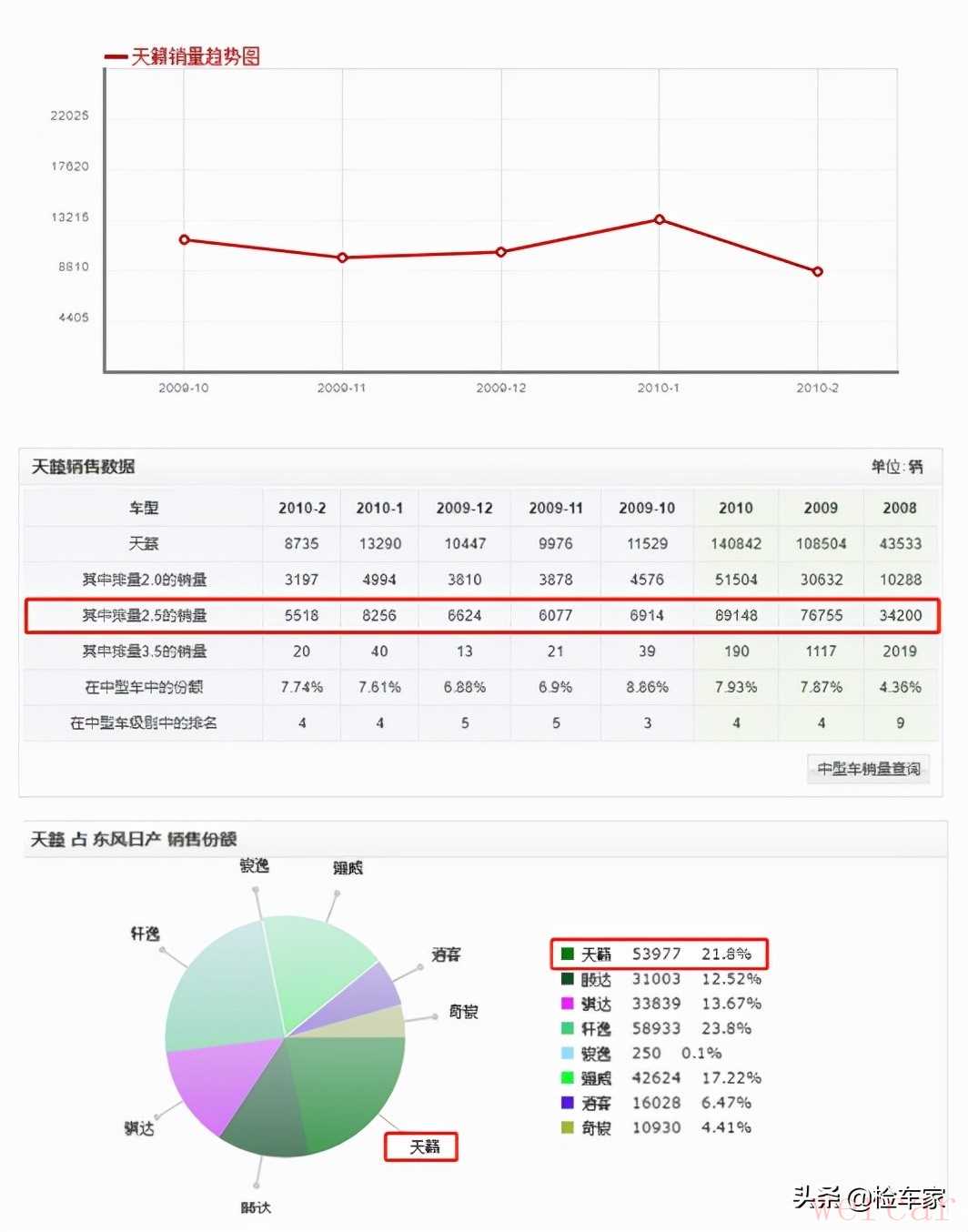 出于好奇,我查询了当年天籁的销售情况。当年天籁在日产车型的销售份额与轩逸不相上下,而2.5排量是天籁车型里销售最好的;近年来天籁已经大不如前,今天要检测的这款天籁在国内二手车市场第一年的保值率平均为70%,第三年保值率平均为60%,天籁前三年高于平均标准。