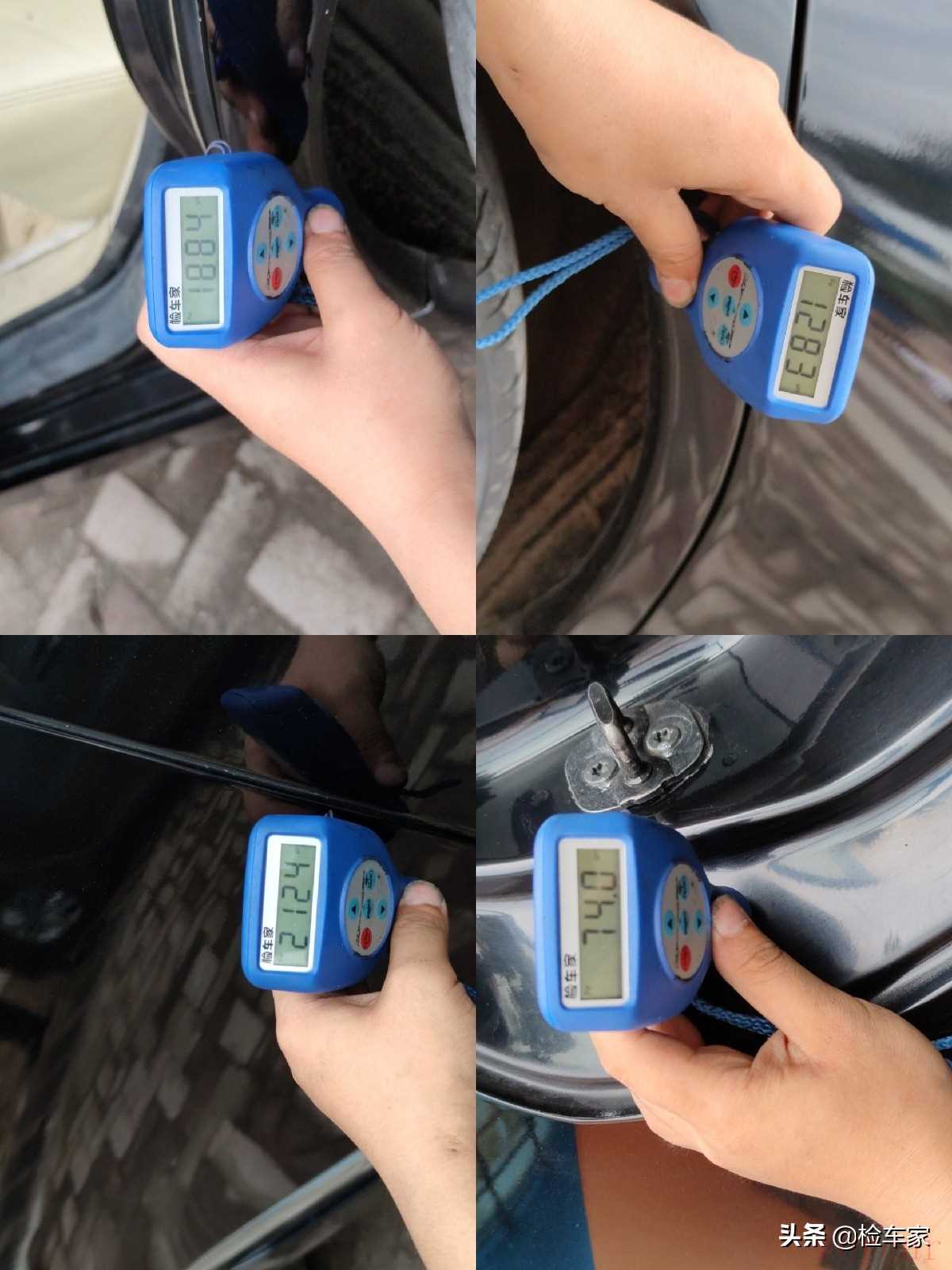 老规矩,检测先从外观开始。经过鲸落仔细观察,发现这辆车飞漆较多,凭着多年的修车经验,我判断车辆可能经过全身喷漆。为了确验证判断是否准确,我请出了检测神器——漆膜仪来检测全车不同部位的漆面数值,发现整车漆面数值都偏高,钣金部位也比较多。这也可以理解:12年了,车主驾驶难免会出现剐蹭、轻微撞击等小事故,全车补补漆面是很正常的事情。