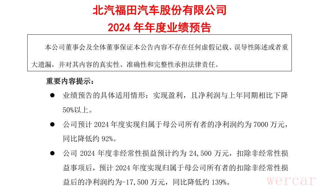1月24日,福田汽车公告,公司预计2024年度主营业务利润约为-1.7亿元,同比减少约6.2亿元;归母净利润约7000万元,同比下降约92%;扣非净利润约-1.75亿元,同比下降约139%。