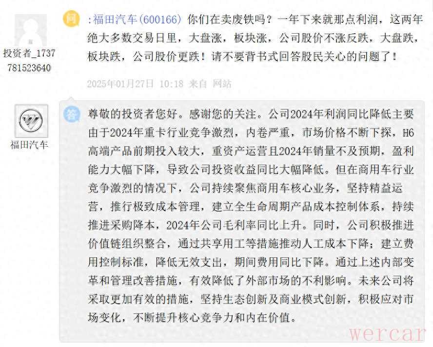 不过,针对股价表现,福田汽车并未给出直接解释与应对措施。