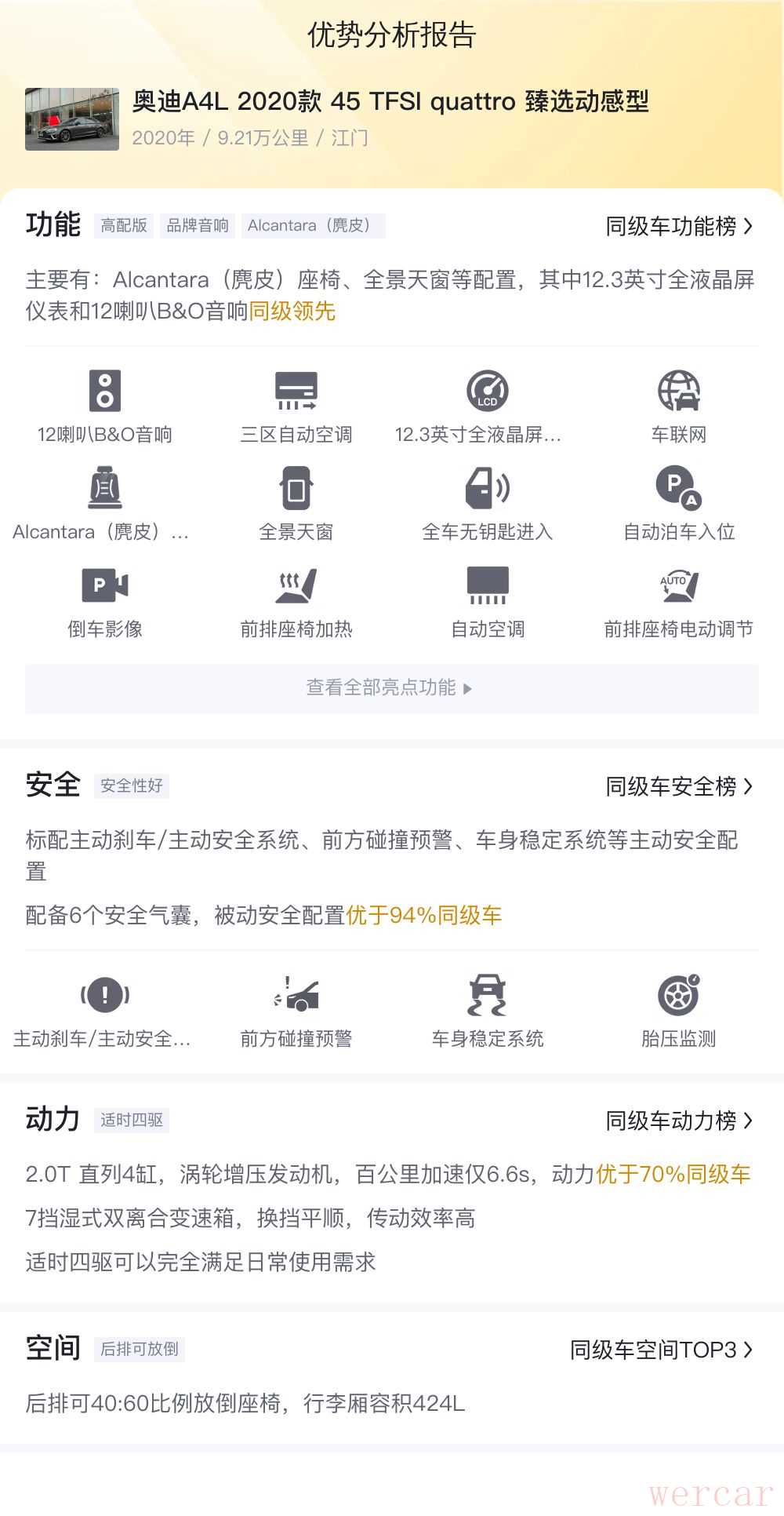 总结:从车辆自身来看,这款奥迪A4L 2020款 45 TFSI quattro 臻选动感型在配置、性能和舒适性方面表现出色,是一款值得考虑的车型。其合理的售价、较低的用车成本和较高的保值率,使其在二手车市场上具有较强的竞争力。然而,由于每辆二手车的车况都不相同,潜在买家在购买前应务必对车辆进行全面检查,包括外观、内饰、工况等方面,特别是要关注是否有事故记录、泡水记录或火烧记录等重大事件。只有确保车辆的车况良好,才能真正体现出这款车型的价值和魅力。同时,买家也应根据自己的实际需求和预算来做出选择,避免盲目跟风或超出自己的经济能力。总之,这款奥迪A4L 2020款 45 TFSI quattro 臻选动感型是一款兼具豪华与实用于一体的车型,在二手车市场上具有较高的性价比和市场吸引力。