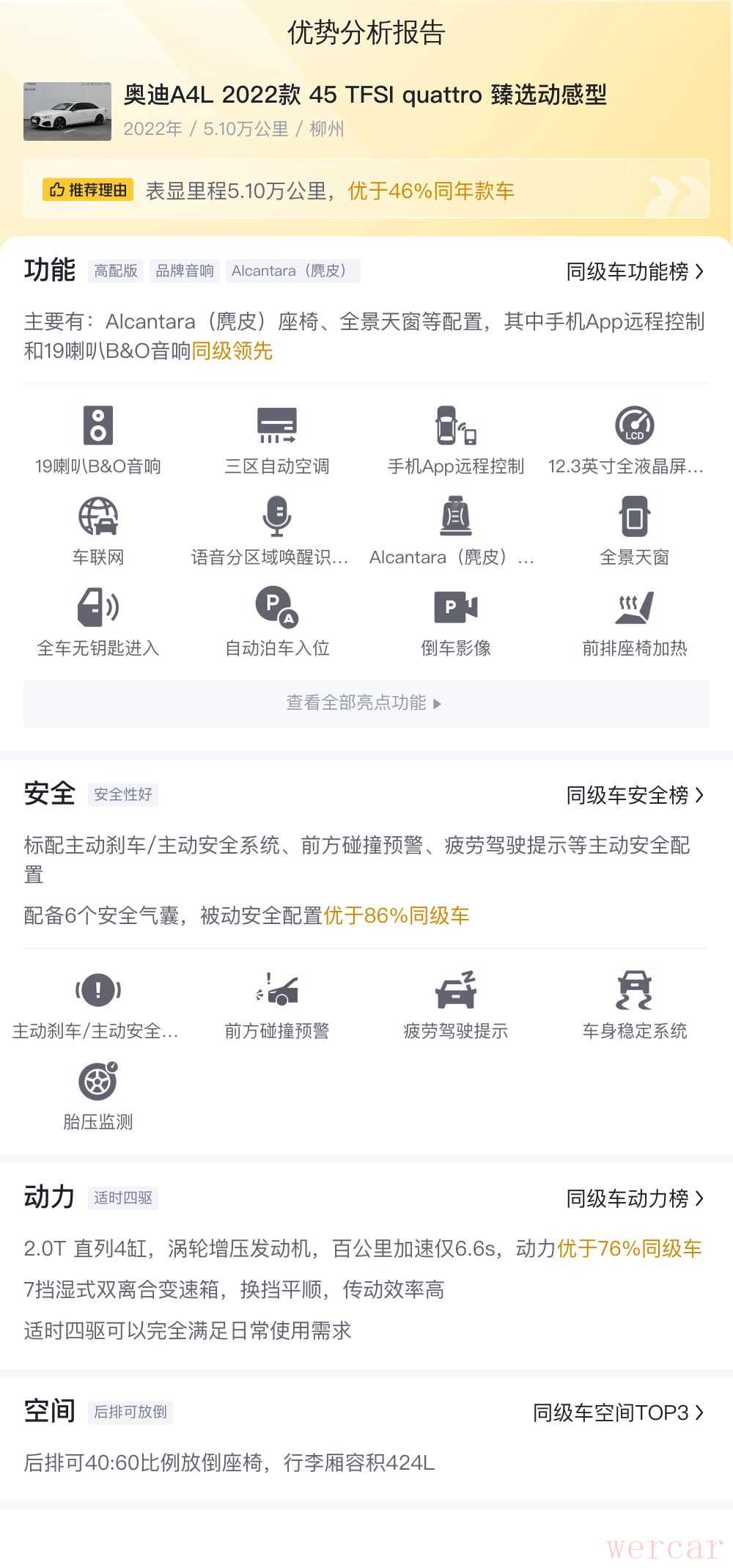 今天介绍的这款奥迪A4L 2022款 45 TFSI quattro 臻选动感型,上牌地为广西柳州,上牌时间为2022年7月,表显里程5.10万公里,新车指导价39.68万,二手车报价18.88万,过户次数1次。支持分期购车,首付金额5.55万便可将其收入囊中。