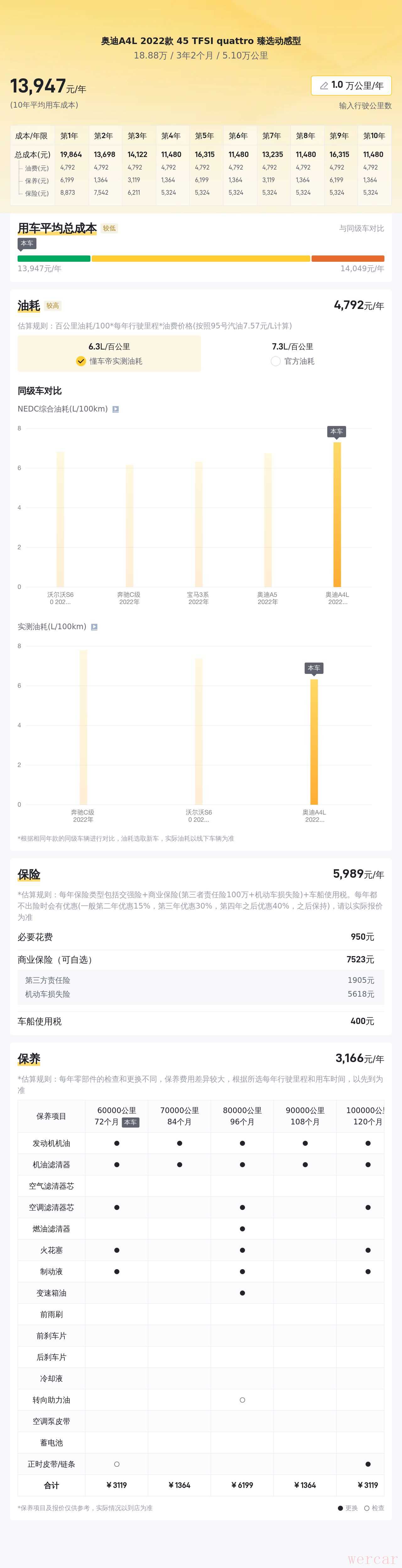 基于懂车帝对奥迪A4L 2022款 45 TFSI quattro 臻选动感型的分析,该车的用车成本较低,被评为“较便宜”。然而,具体到每位车主的使用情况,实际支出可能会因驾驶习惯、用车环境、燃油价格等因素而有所不同。因此,以下提供的数据仅供参考,不作为衡量所有车主用车成本的绝对标准。