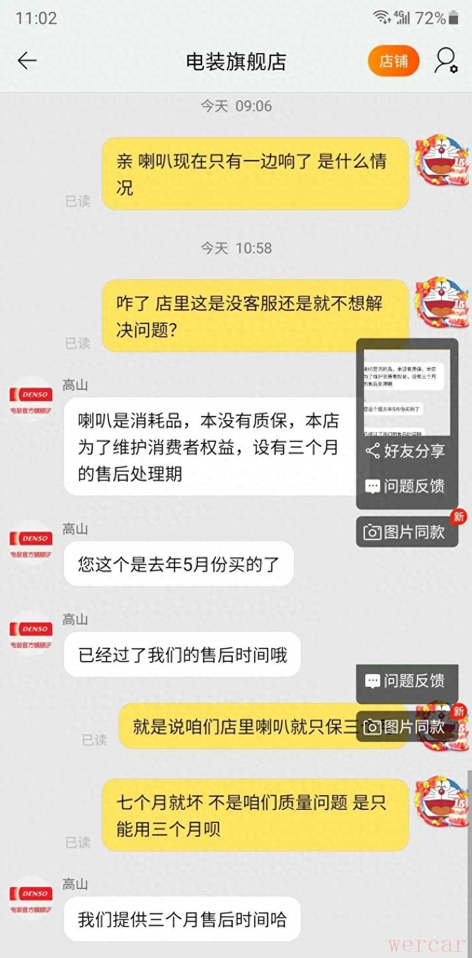 去年5月在某宝电装旗舰店买了一副改装喇叭,装上后使用正常,今天早上开始突然一个喇叭不响了,这才刚使用了七个月,想着一般产品都是一年保修,就找了电装客服。