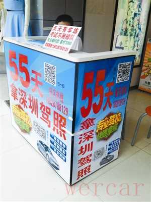 记者在其位于西丽多彩城一楼的办公点看到,办公点就在电梯楼道下一个不足5平米的地方。广告有两种,一种是“粤港驾校”,深圳班55天拿证;一种是上述杨先生他们投诉的情况。一工作人员坦言,两个月拿下驾照确实有难度。记者追问为何要这么误导学员时,他笑笑说广告都是这么做的,否则怎么拉客?