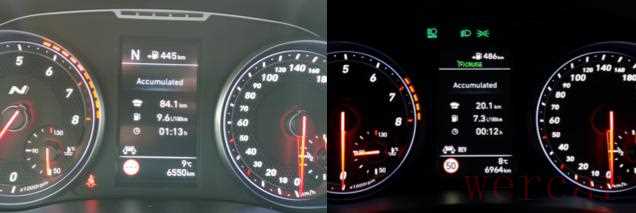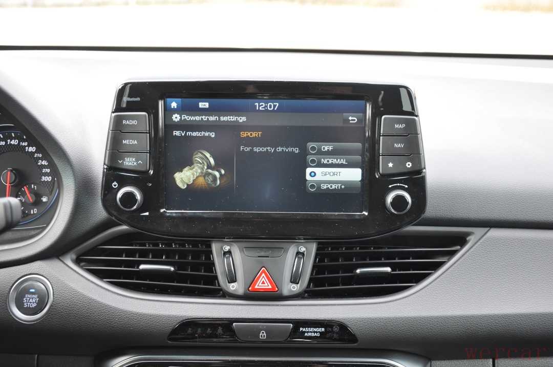 最让人惊喜的是Rev Match。之前提到i30N变速器的速比布置较为绵密,势必导致频繁地升降挡。但并非所有人都能持续稳定地进行降挡跟趾操作,Rev Match就变成了一个非常有用的配置,甚至是i30N上最为出色的一个功能。不同于其他车型仅有开关选择,i30N的Rev Match有三种不同模式:Normal、Sport以及Sport+,方向盘上有开关快捷键,不同模式则通过车辆模式调节页面进行选择,以不同颜色的REV图标显示在仪表盘液晶屏中,不同模式之间的差别是转速调整的速度。